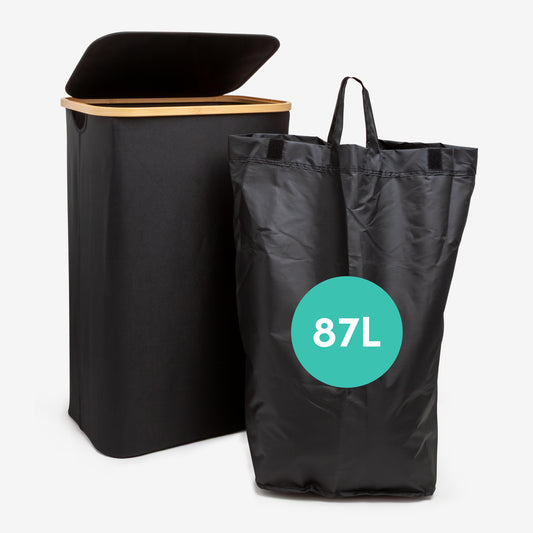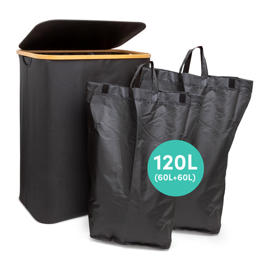 Dual Sections Bamboo Frame Hamper with Lid and Removable Bags