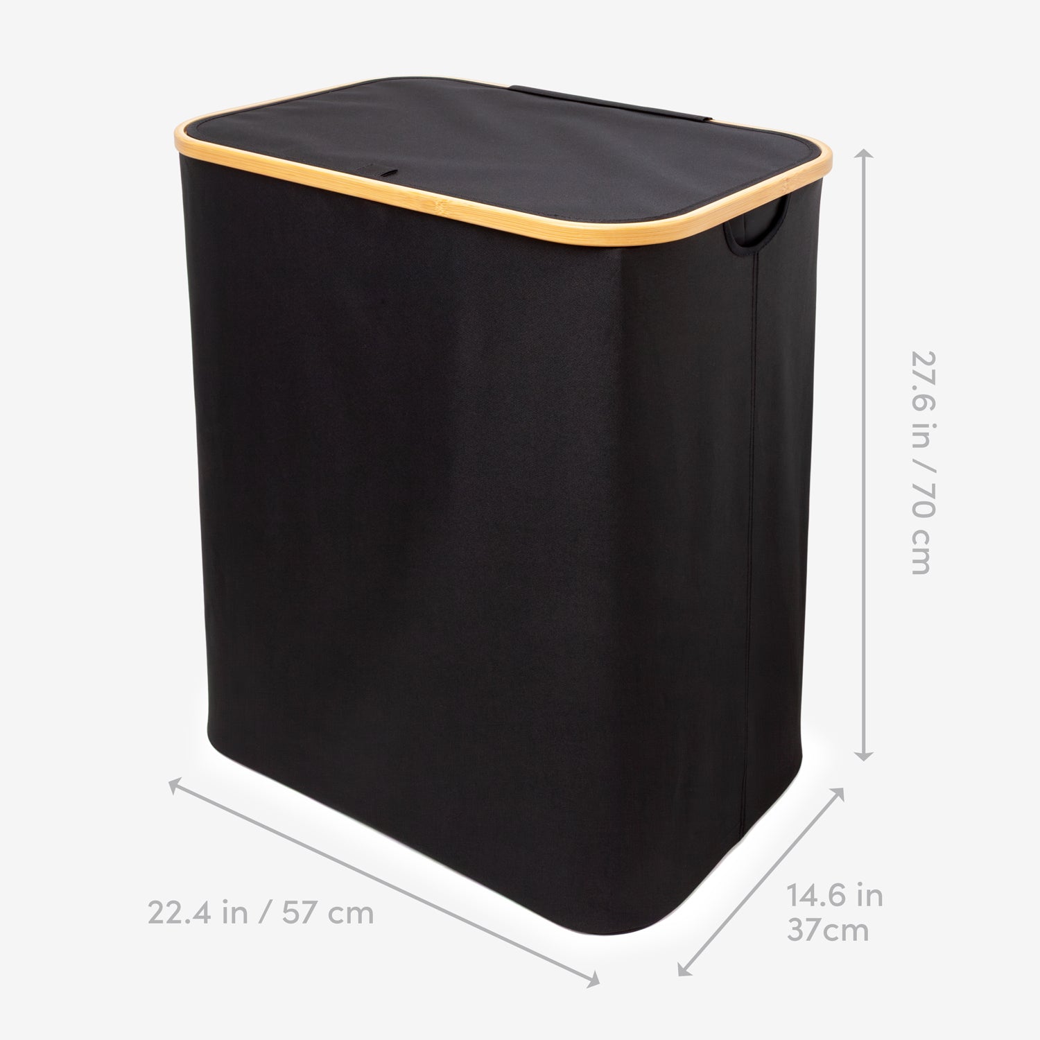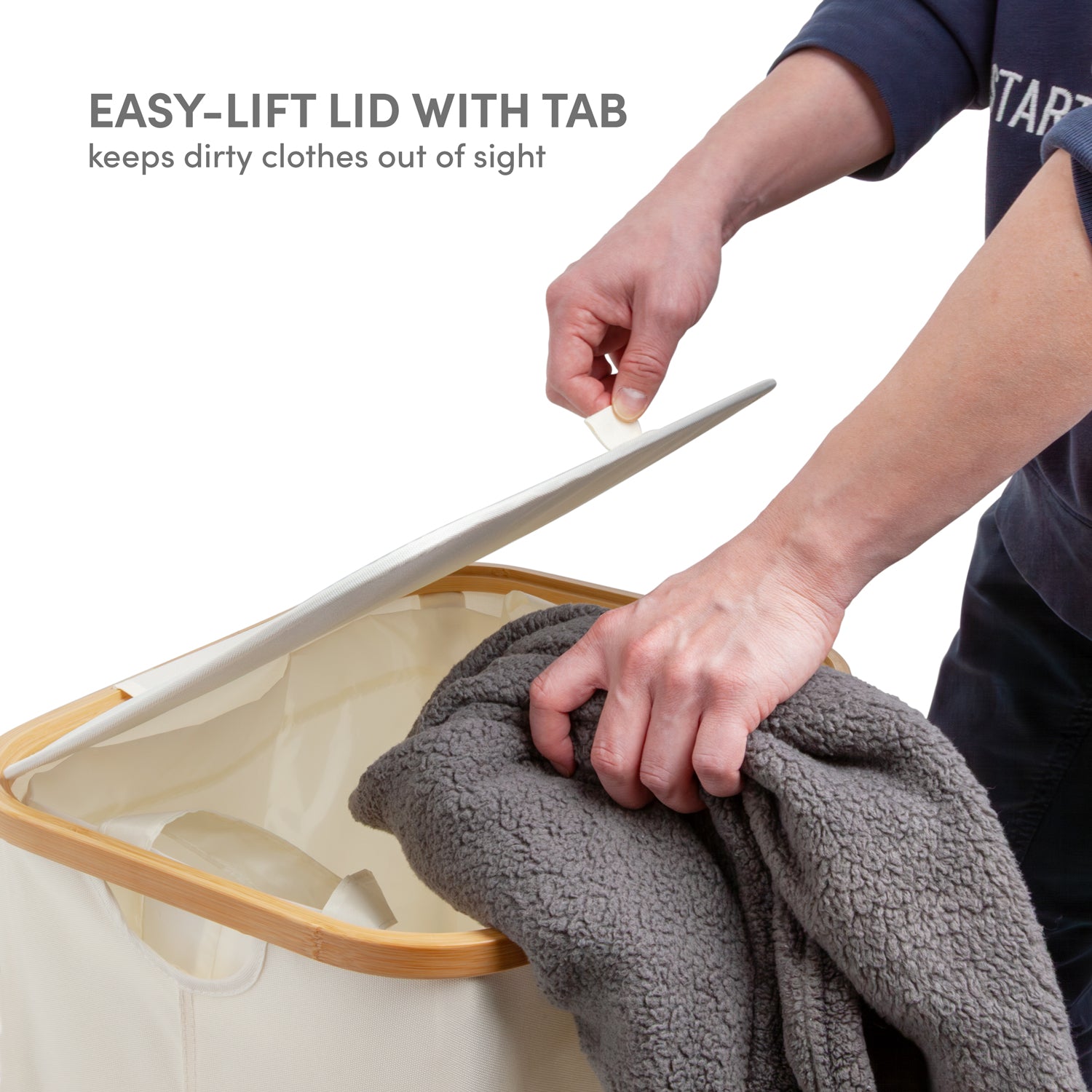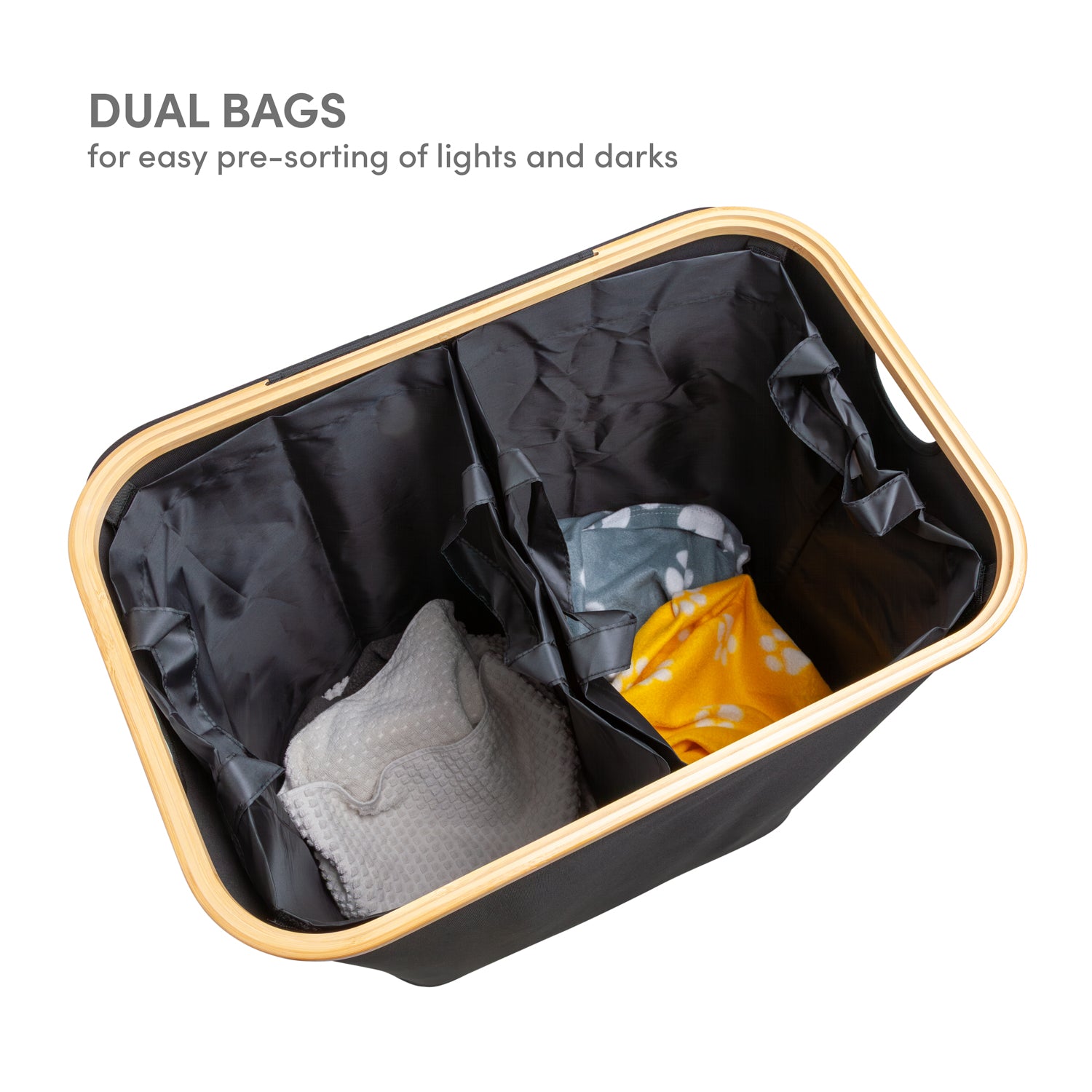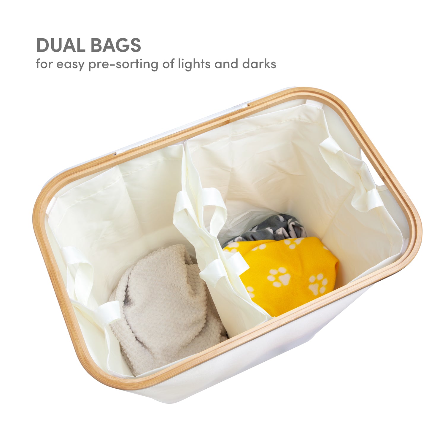Dual Sections Bamboo Frame Hamper with Lid and Removable Bags