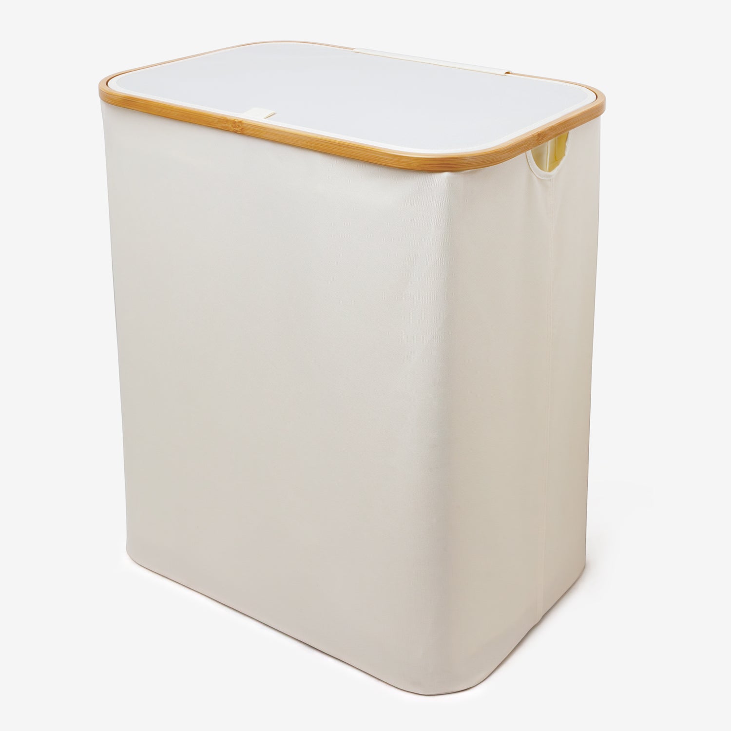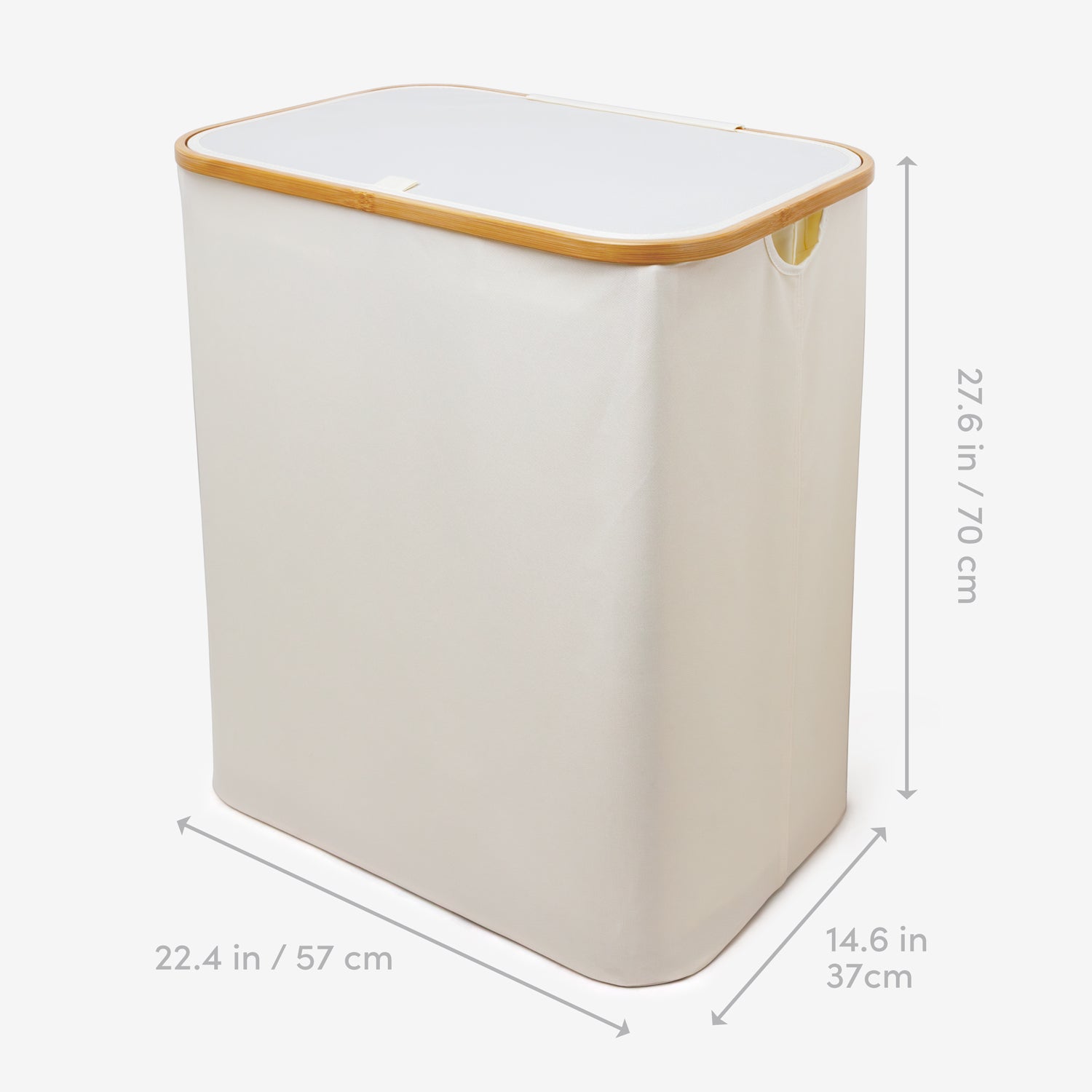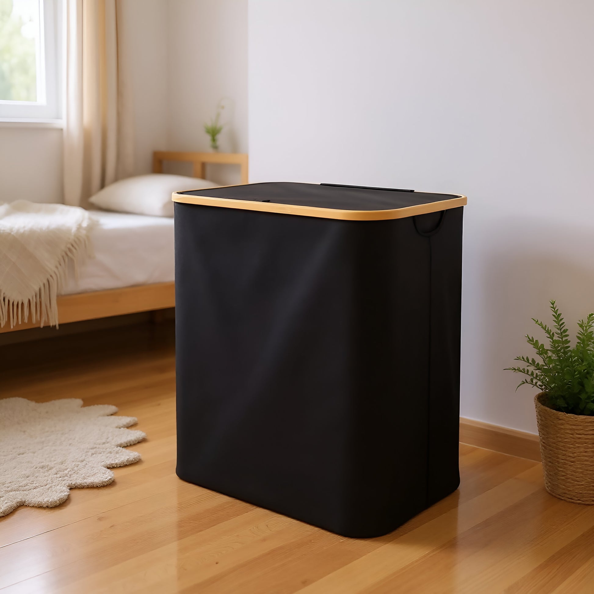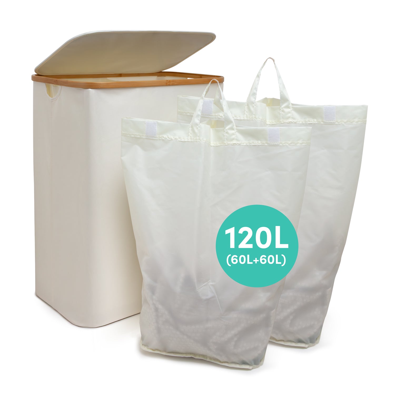 Dual Sections Bamboo Frame Hamper with Lid and Removable Bags